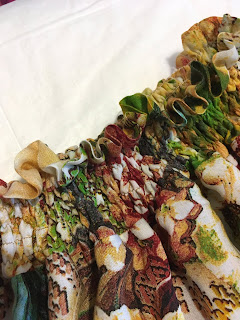 Перед и спинка на половину ширины ткани и это на 6 см меньше, чем по выкройке 34 размера. Нижний волан - две ширины ткани, а верхний - одна ширина ткани, что конечно же очень мало! В идеале тоже надо было две ширины ткани, у меня совсем уж куцый. Но ткани уже не было вообще! Не хватило ни то что на пояс, а даже на обработку пройм (сделала бейки из белого батиста).